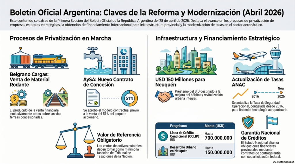 - AySA (Resolución 543/2026): Se aprueba el nuevo modelo de «Contrato de Concesión» previo a la venta de las acciones estatales.