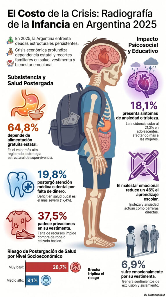 Esta imposibilidad de acceder a ropa o calzado adecuado funciona como un factor de aislamiento social. El 6,9% de los afectados sufre daños emocionales por no poder «encajar» con sus pares, lo que impacta directamente en su integración escolar y social, especialmente en zonas críticas como el Conurbano Bonaerense.